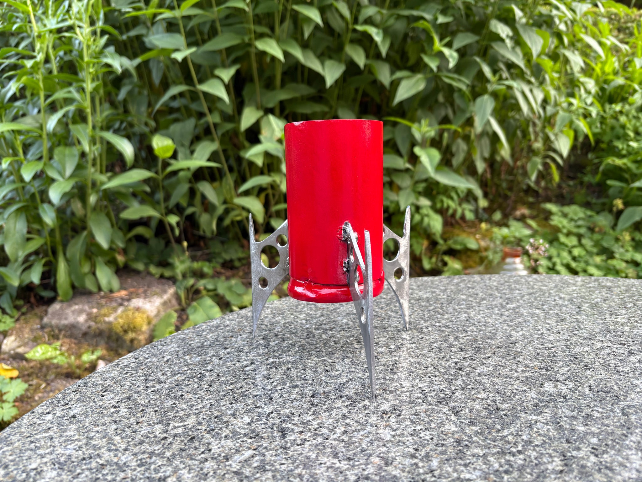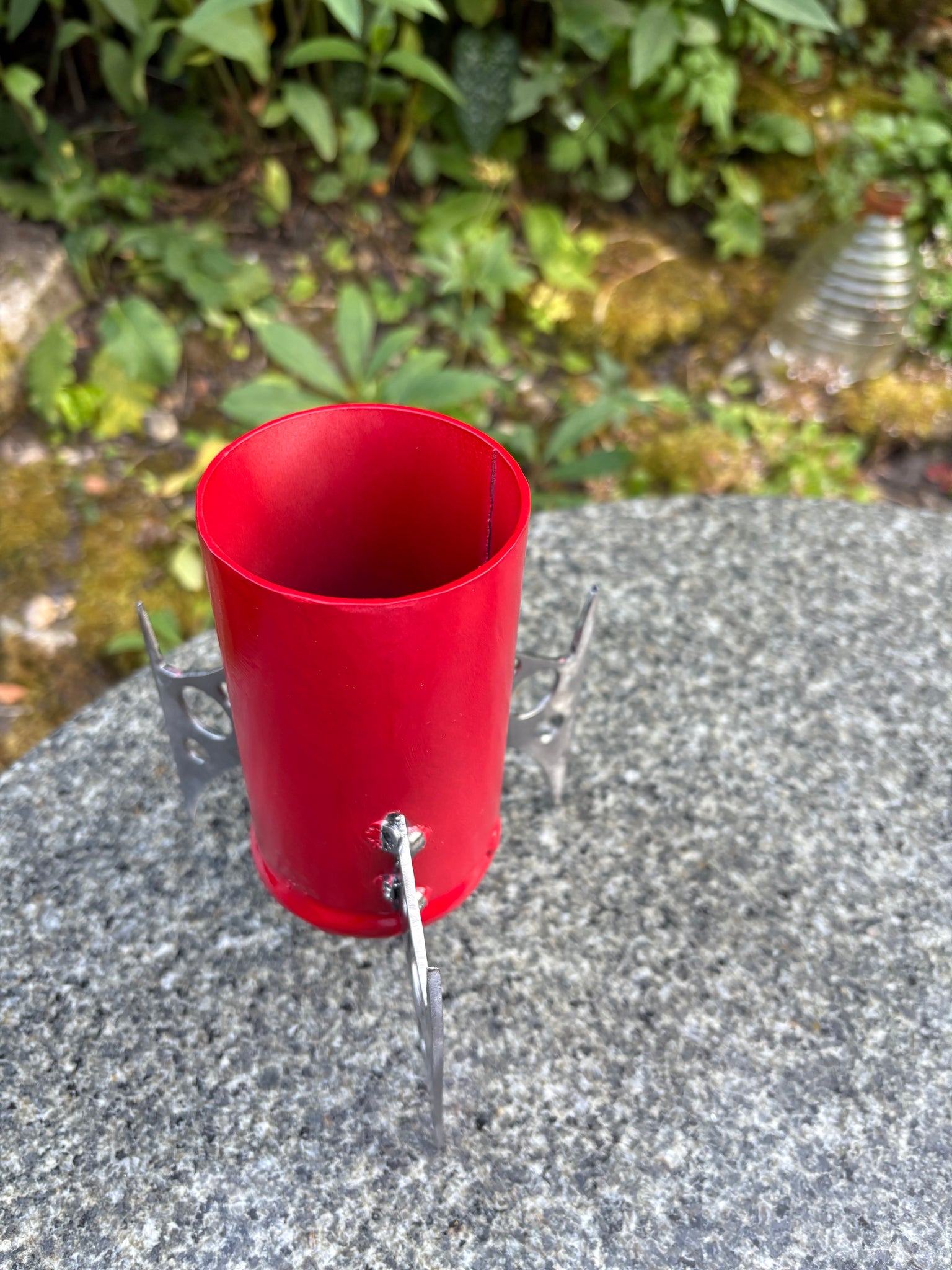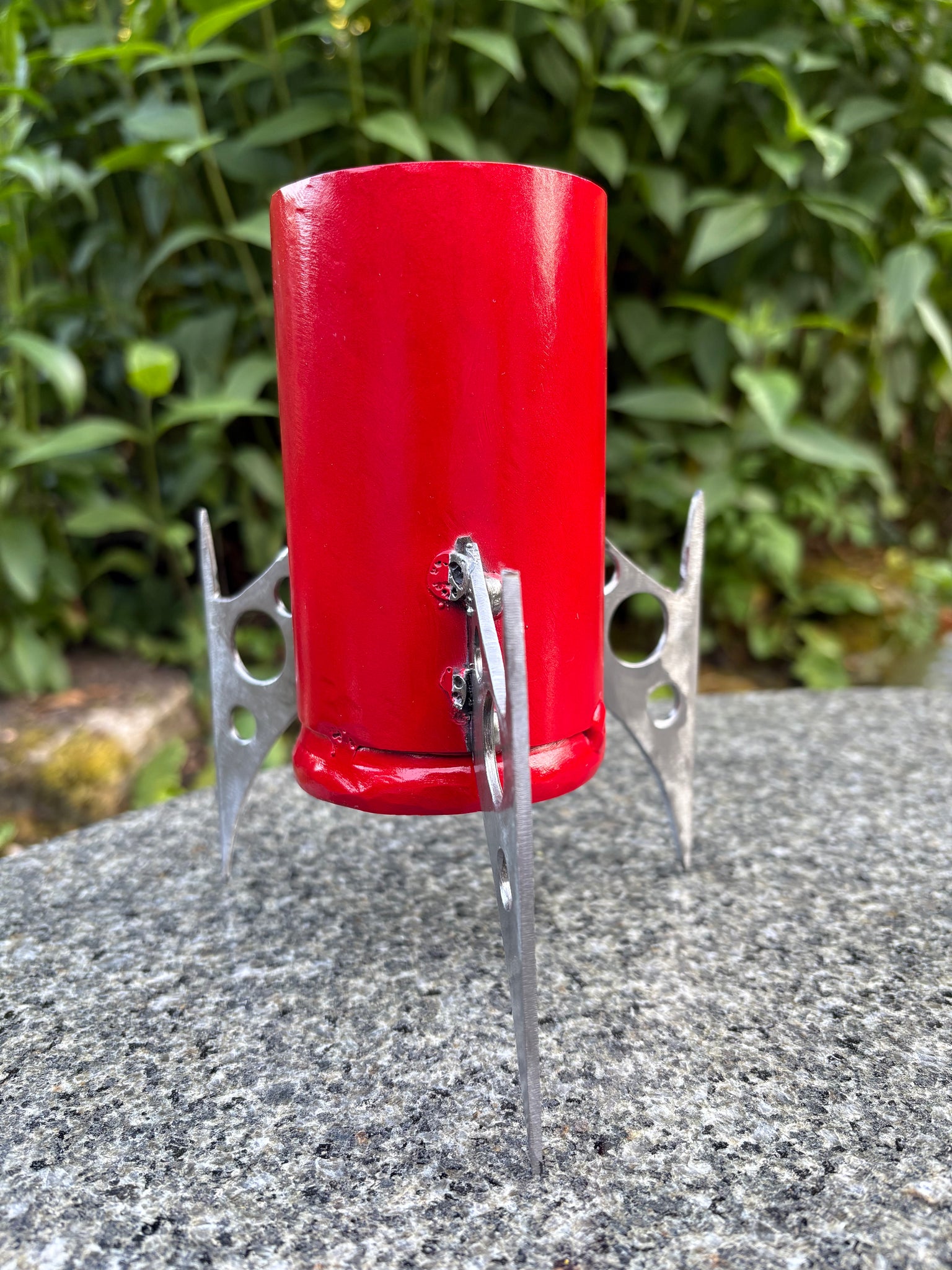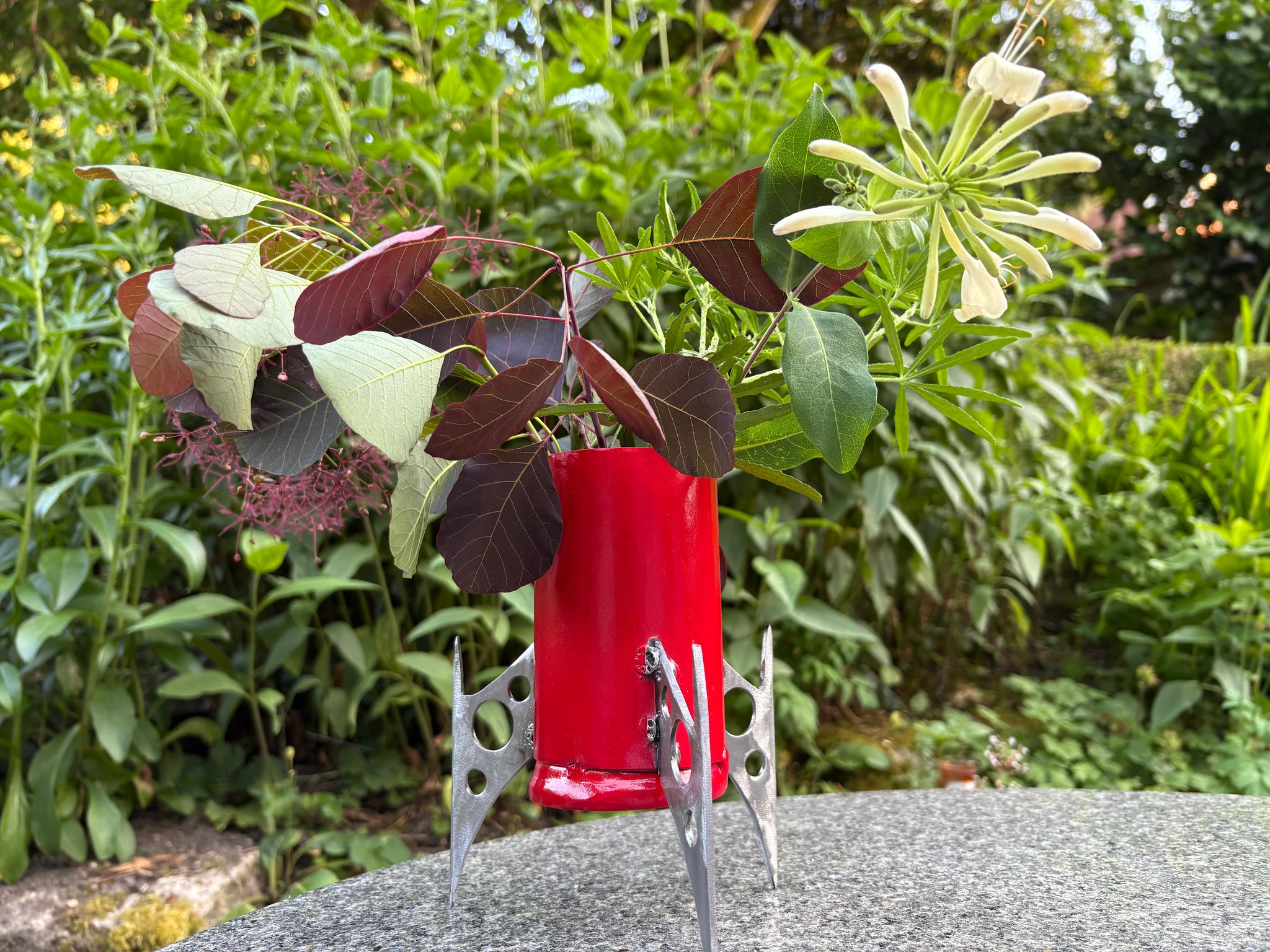 A retro vase made from repurposed metal , can be used for wet or dry flowers .