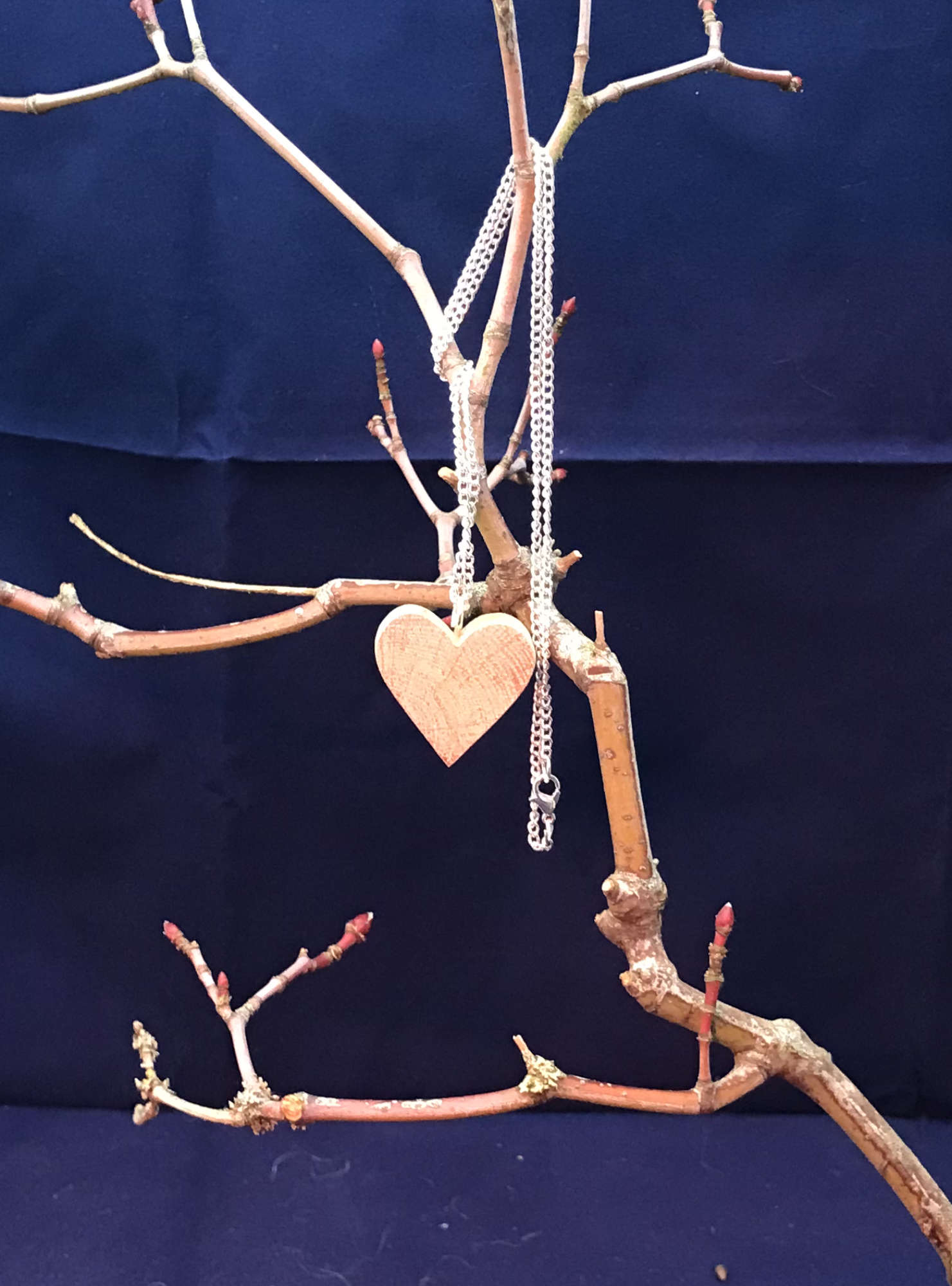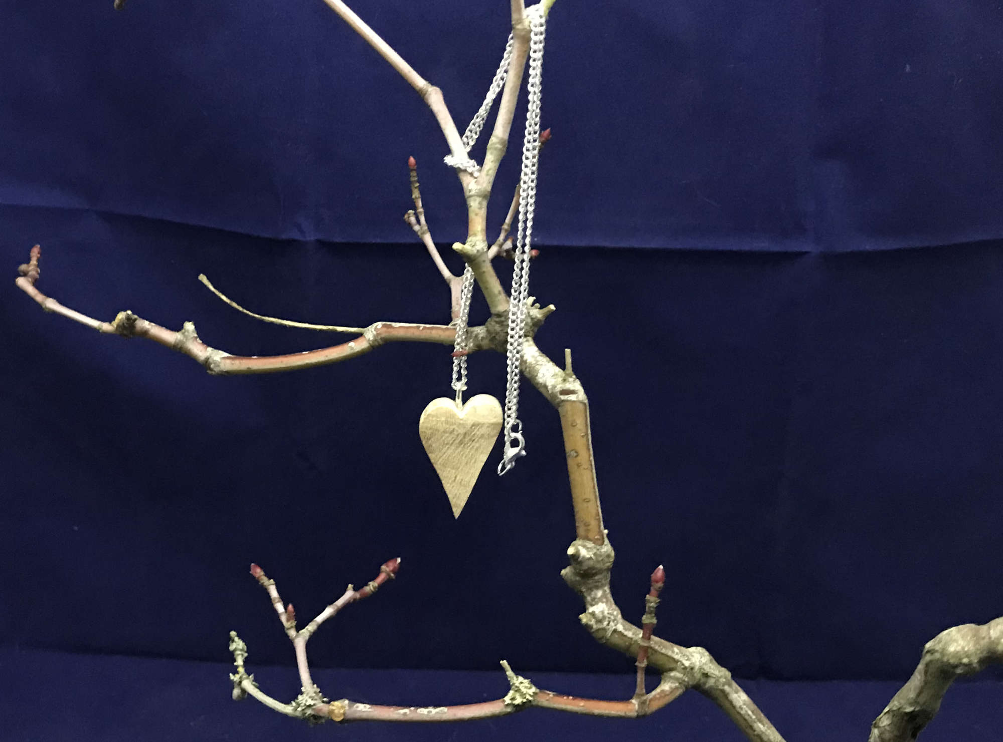 The Micro Heart Collection, all the hearts are carved from foraged Oak. There are 3 distinct shaped hearts to chose from: Standard shaped Heart; Ornate shaped Heart; Long shaped Heart. Each Heart comes with a 450mm length silver plated chain, and a red velvet draw bag to store your necklace is included