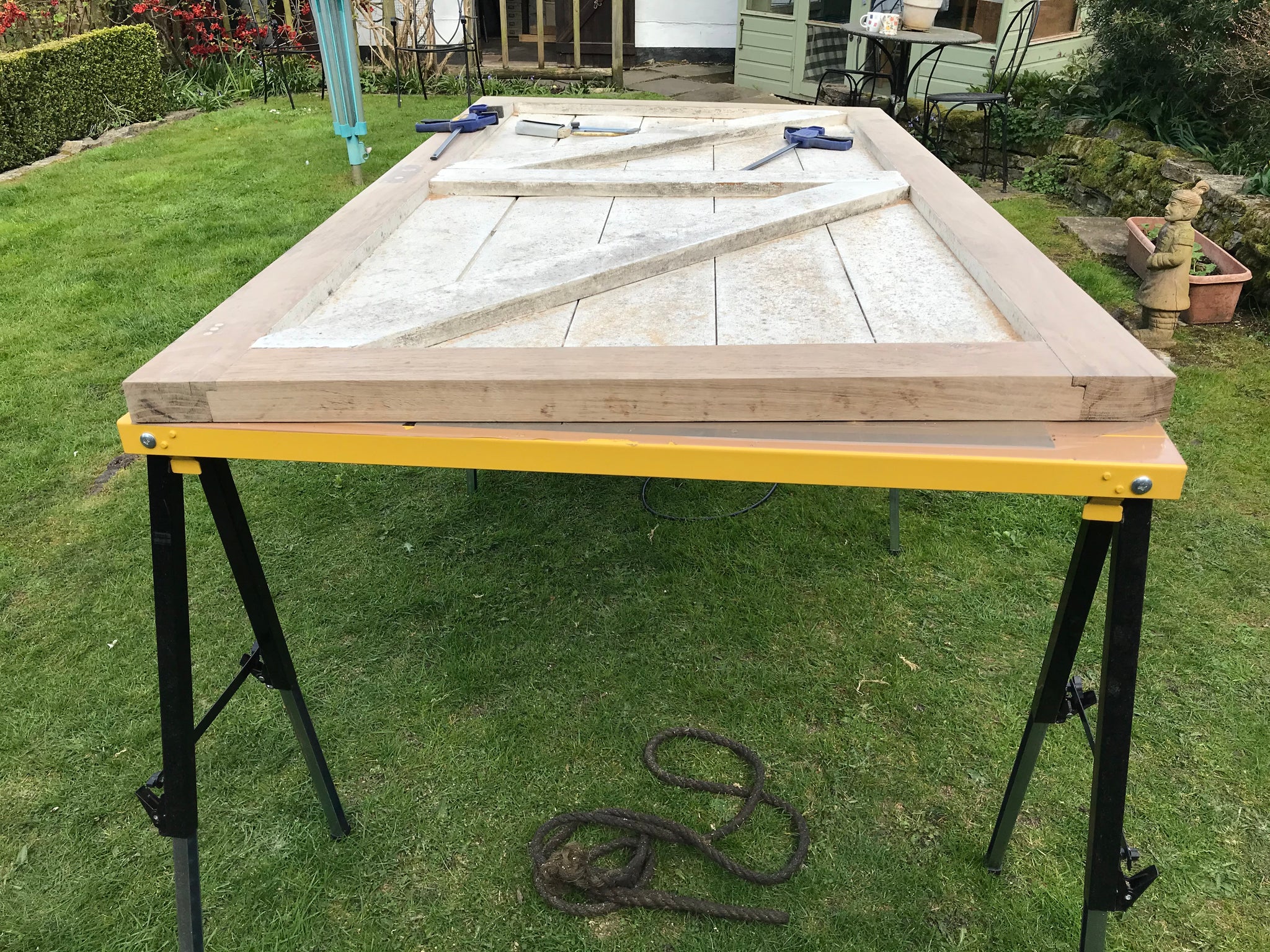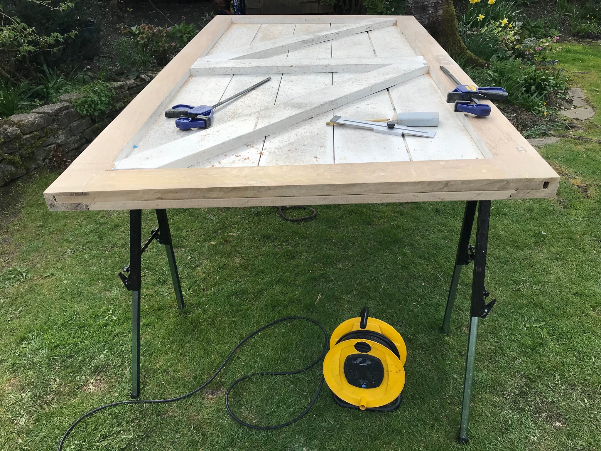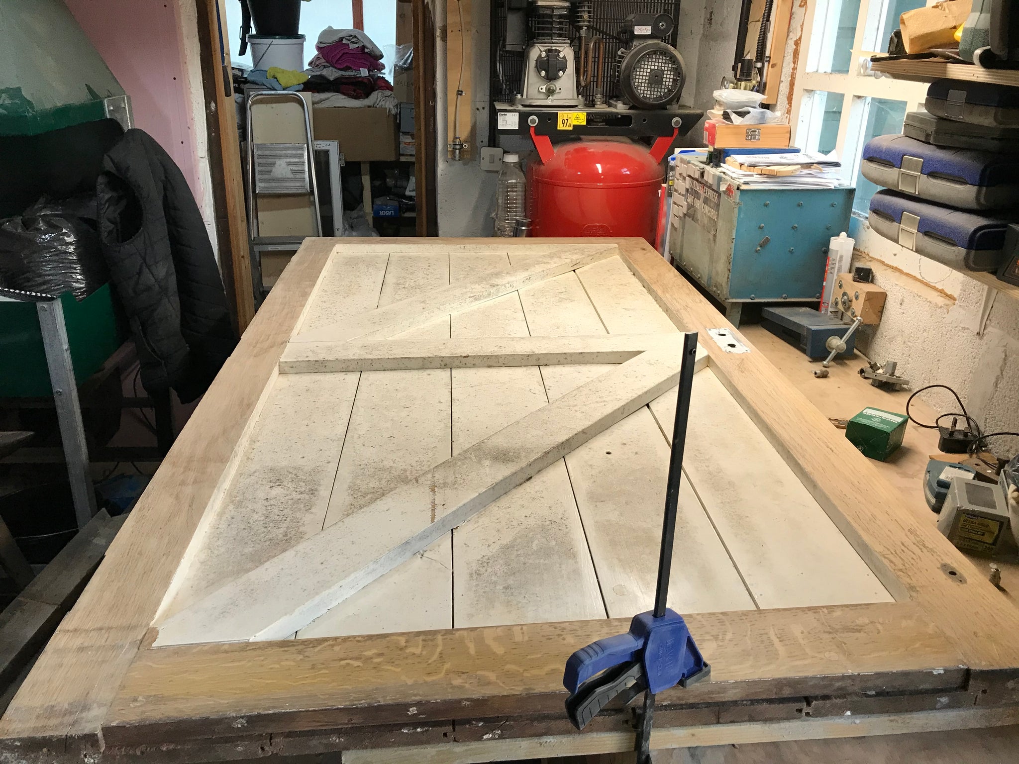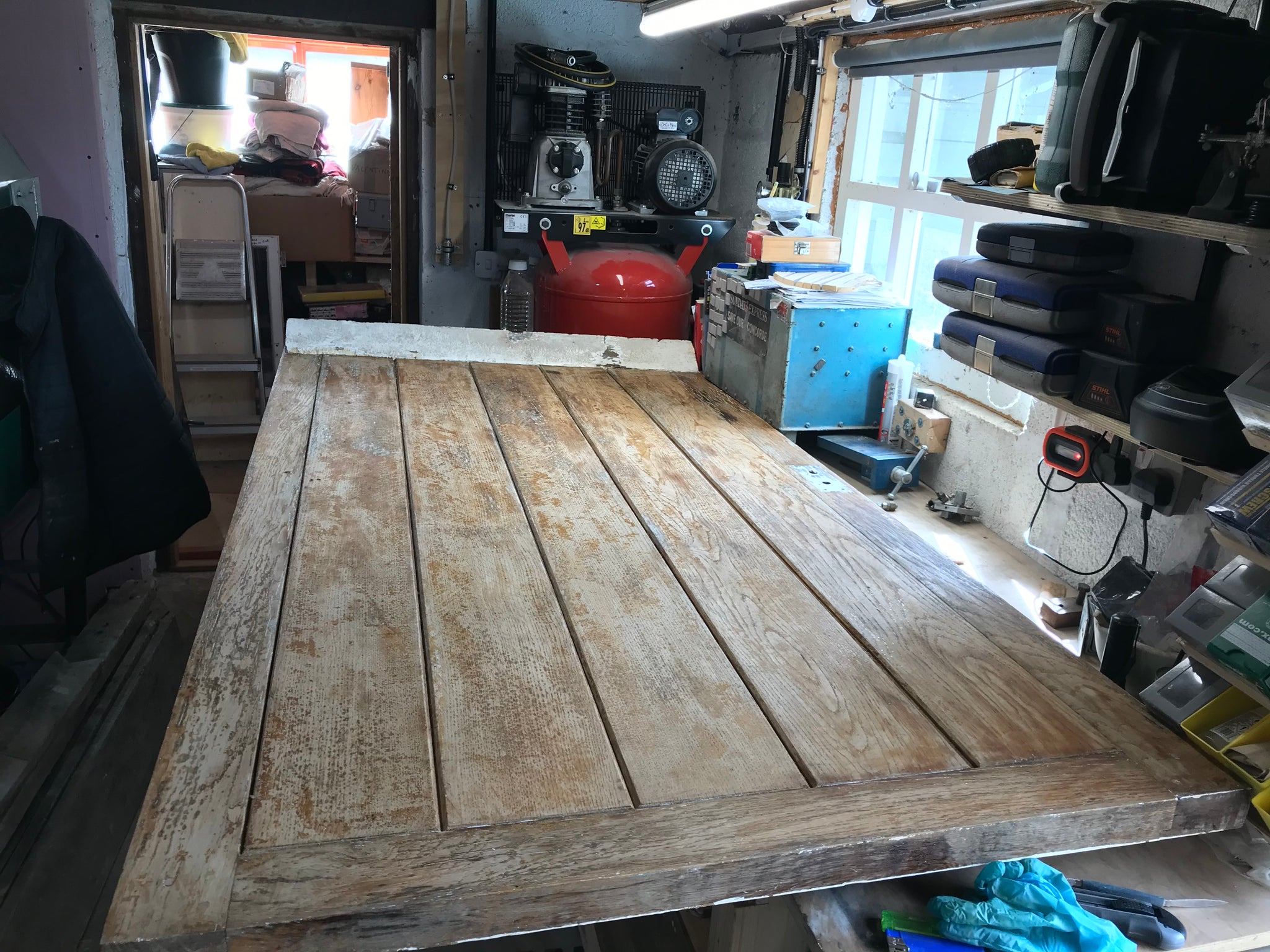 7 foot x 5 foot, 3” thick solid Oak, tongue and groove framed 150 year oak door. Been in a farm outhouse for 30 years