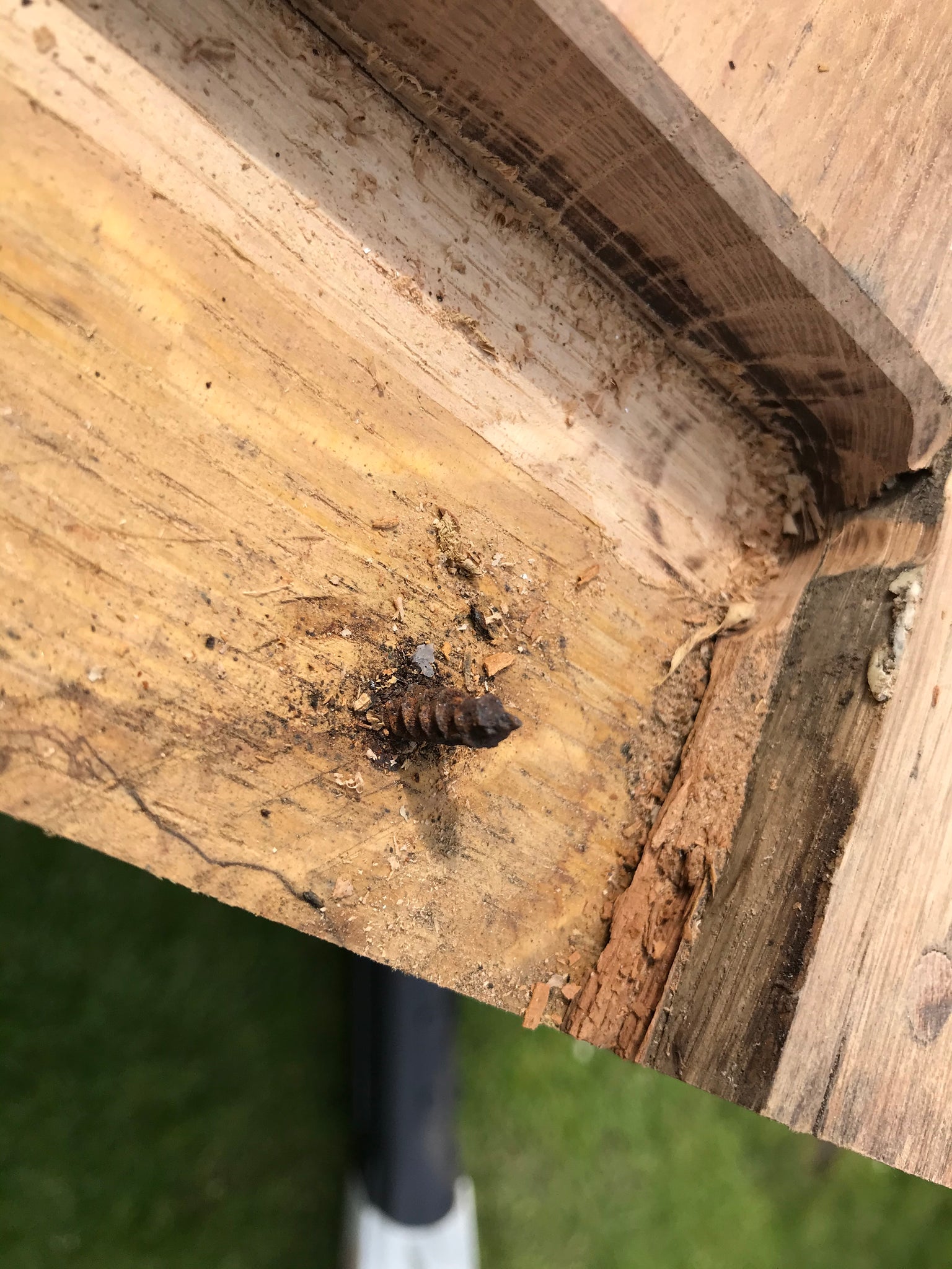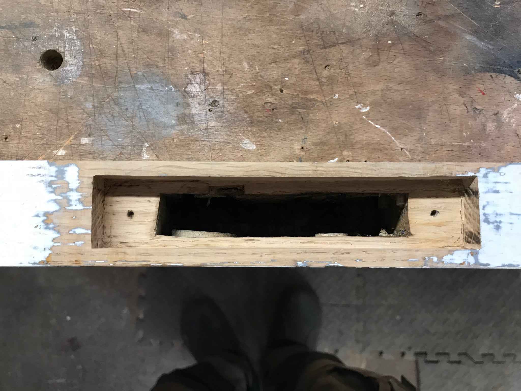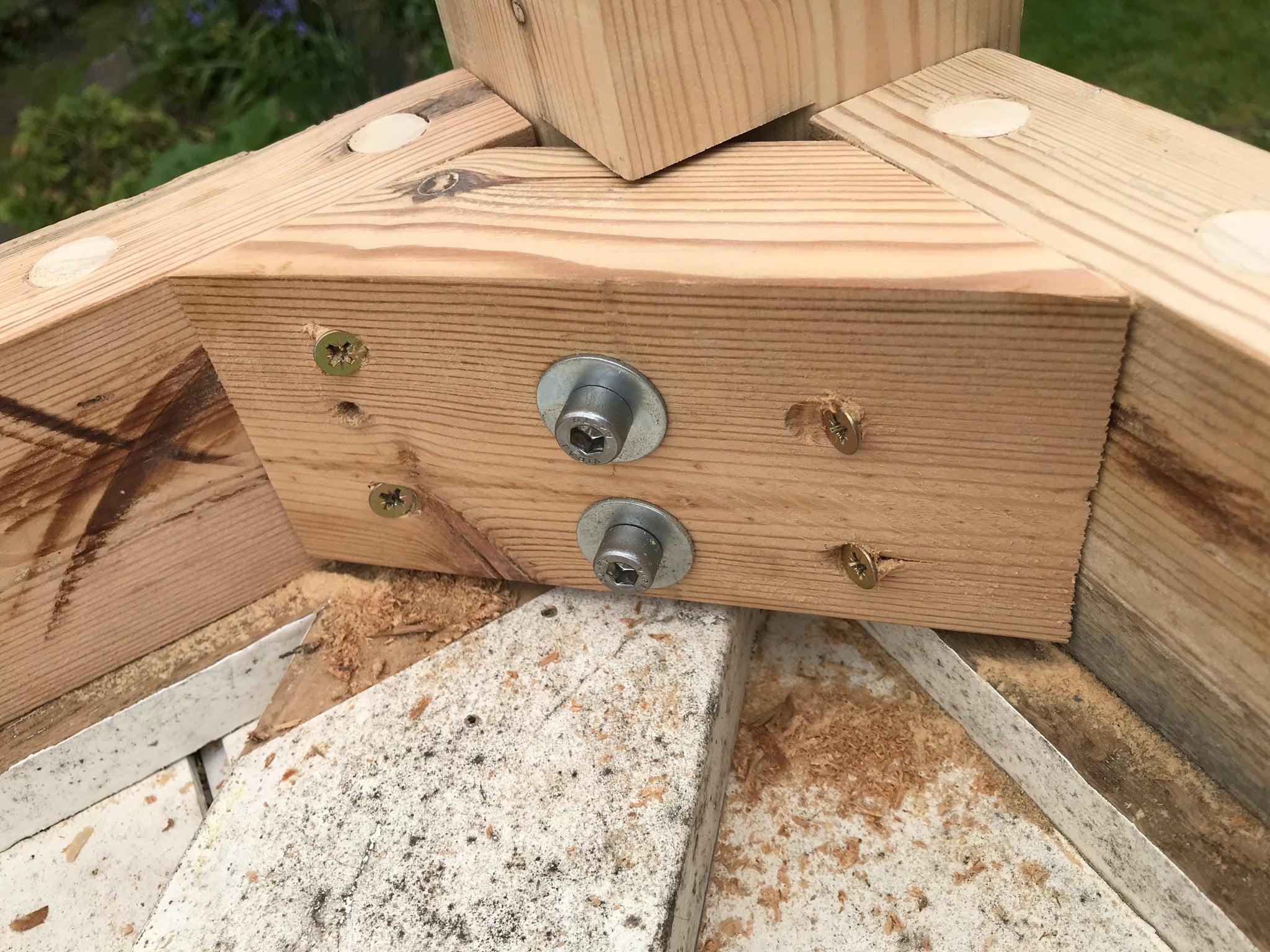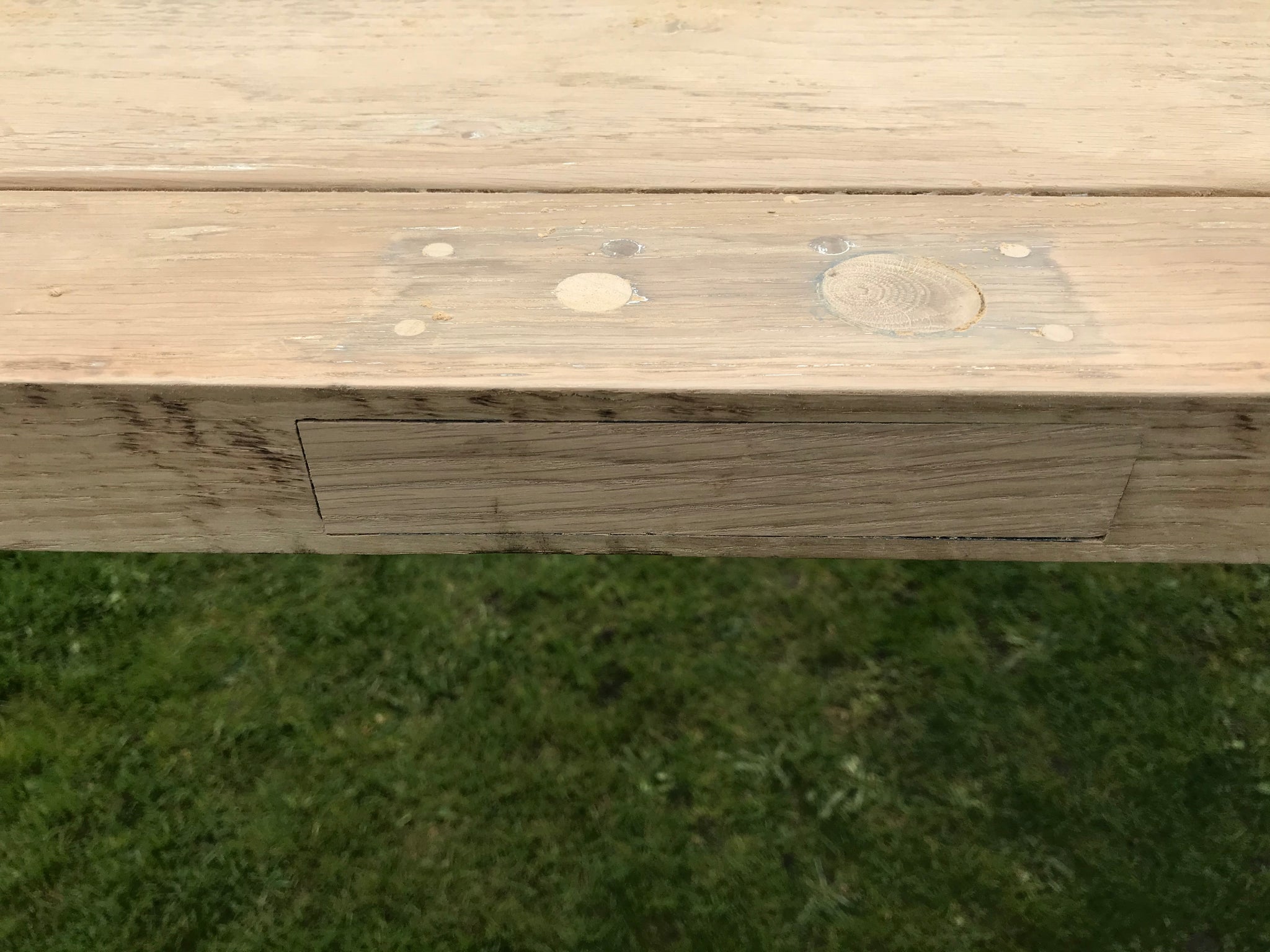 Surplus wood used for anchoring legs to table beams, alas using modern screws