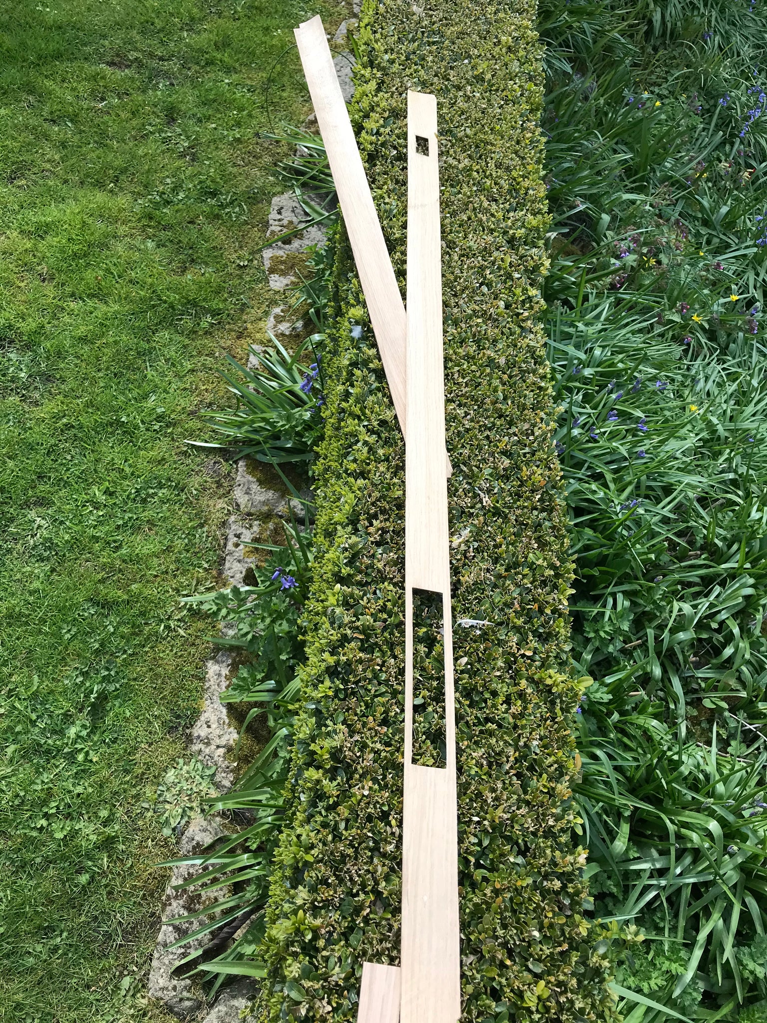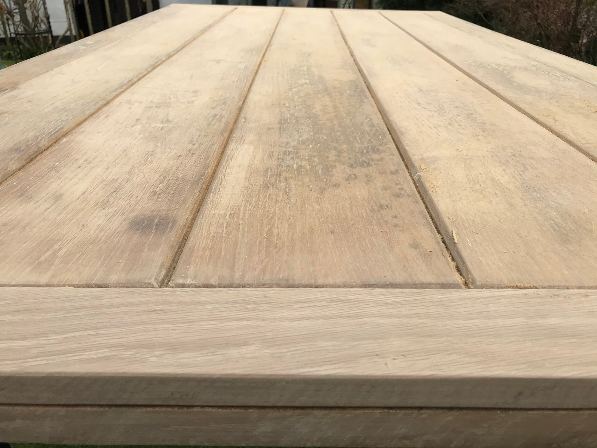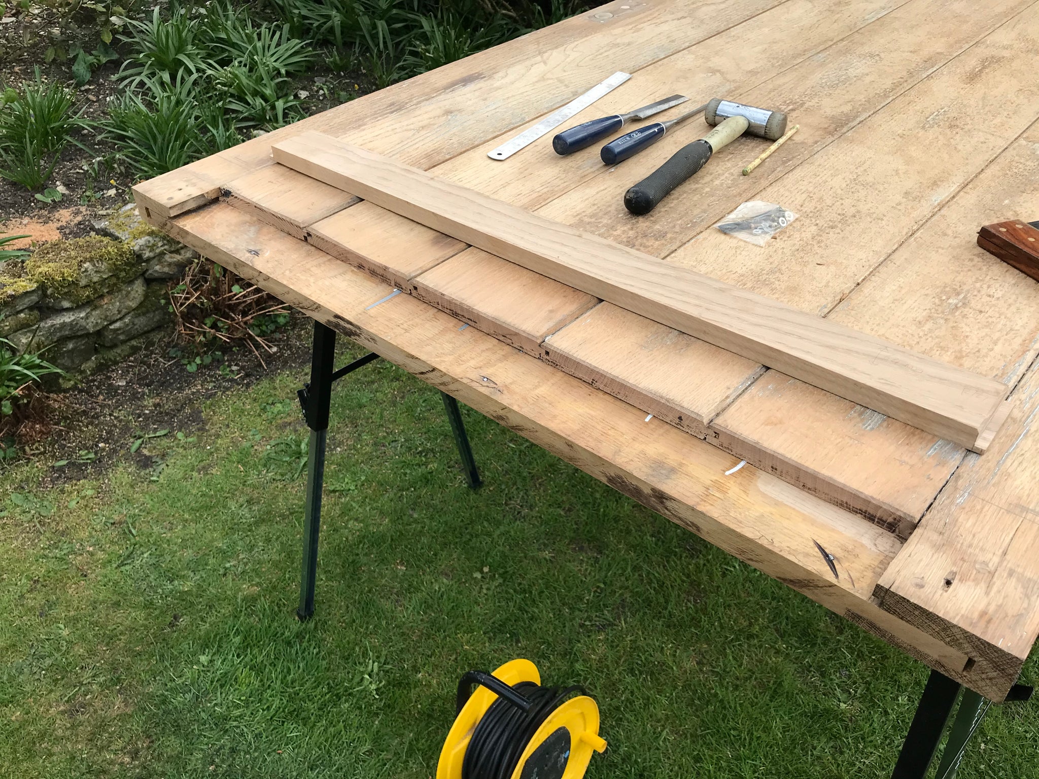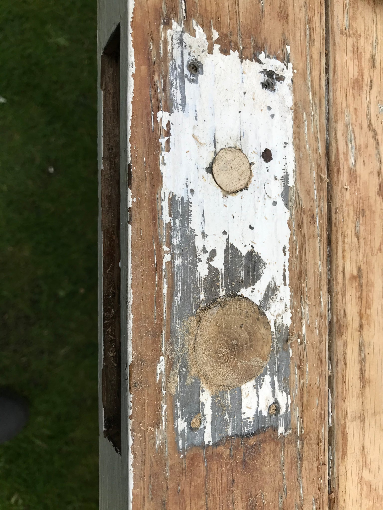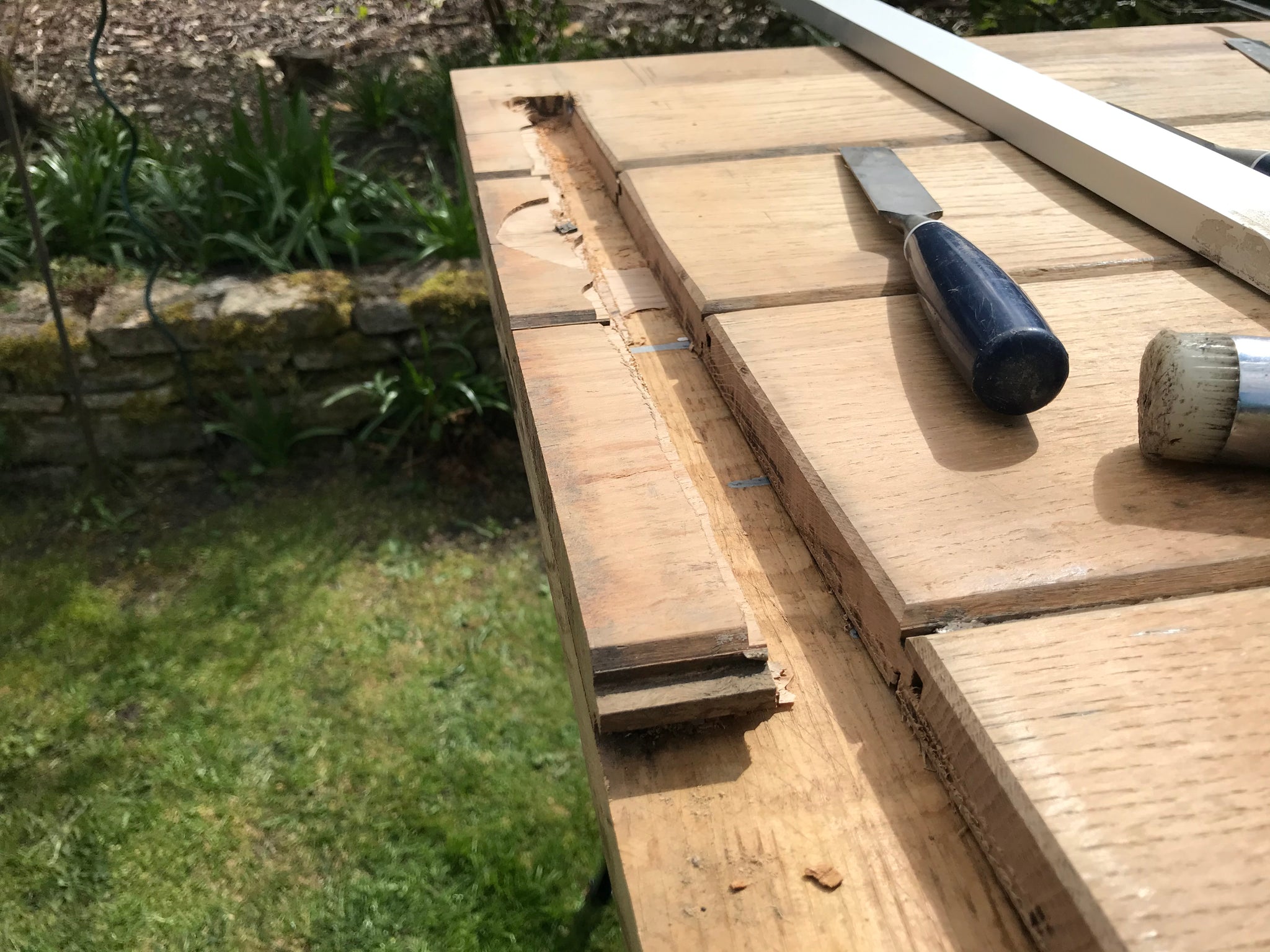 Removed rotten weather strip base of door, replaced and machined to match four tongue and groove lengths from reclaimed Oak.