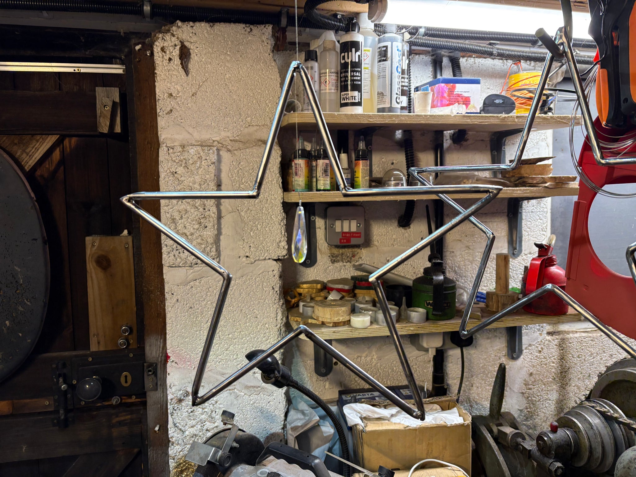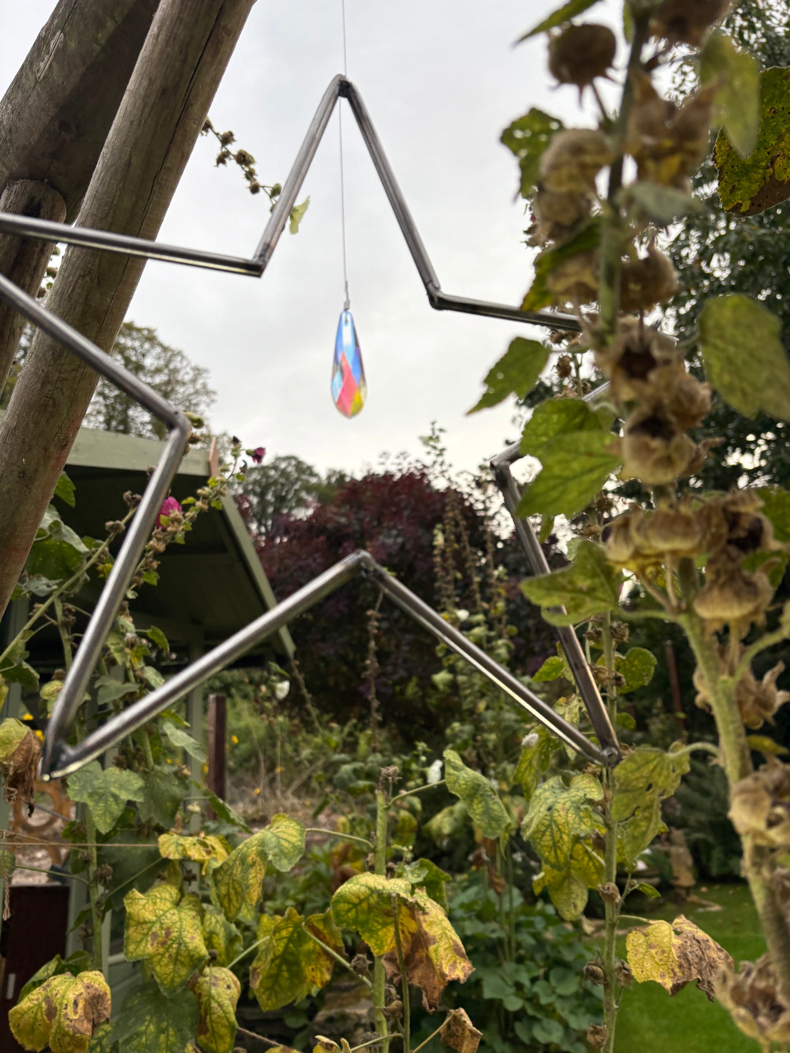 Repurposed Metal star with a crystal at its heart, a stainless steel  micro rope with a hanging loop securing the star & crystal