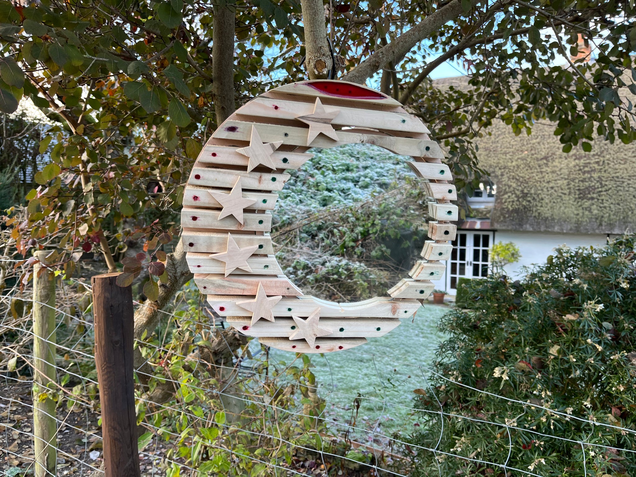 Treated with clear weather proofing if you want to hang it outside